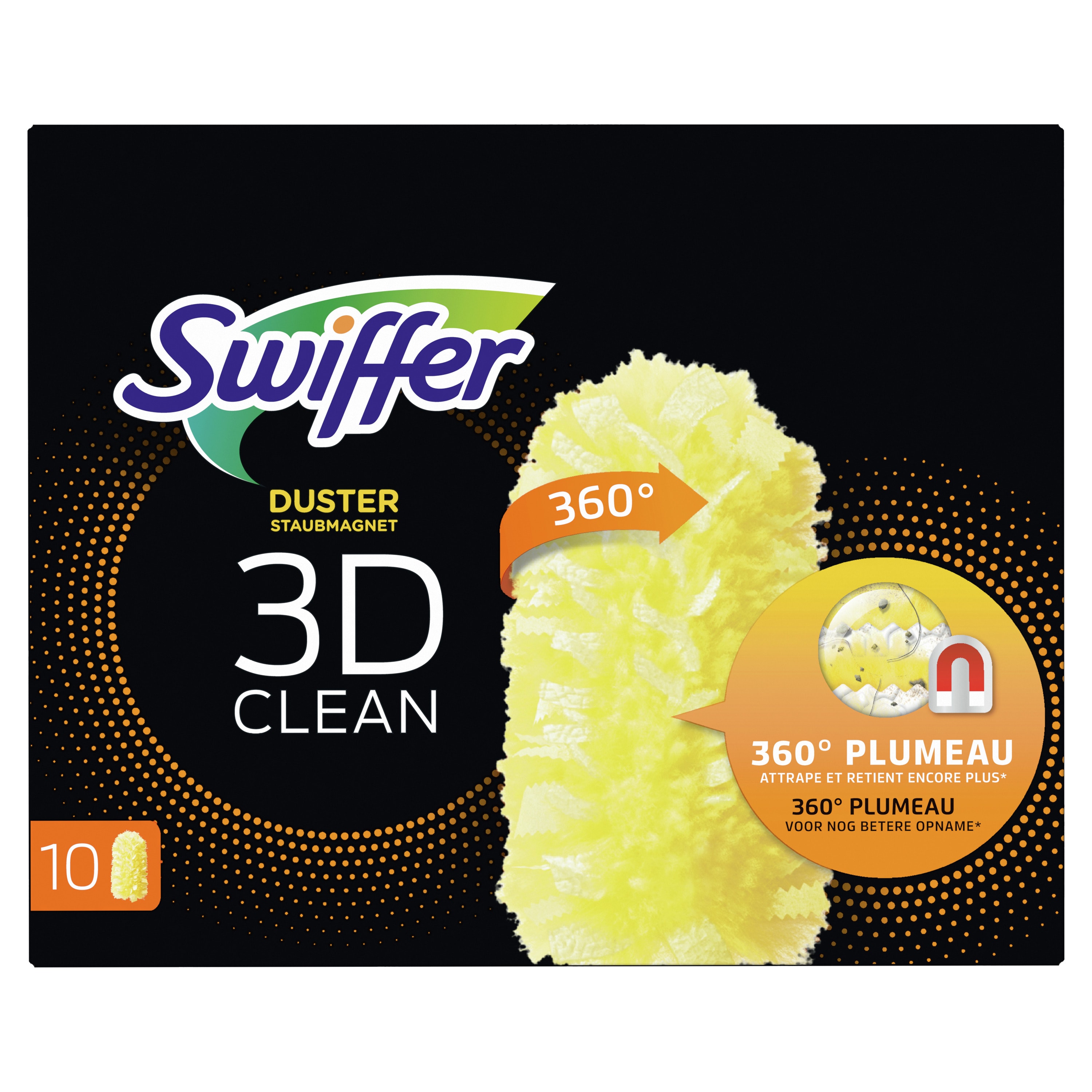 Le kit balai 3d clean se compose d'un balai swiffer classique, de 4 lingettes sèches 3d clean et de 2 serpillières swiffer imprégnées de solution nettoyante.